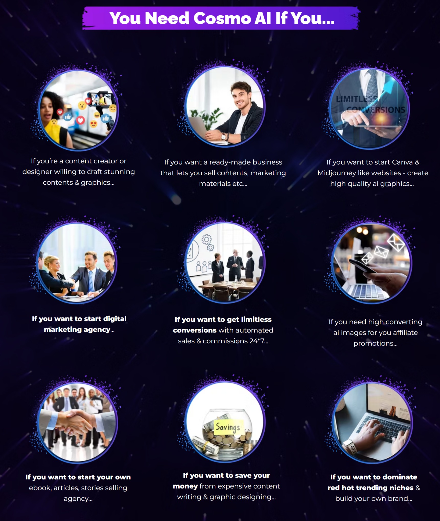 Whether you are a content creator, marketer, business owner, freelancer, or agency, Cosmo AI can help you save time, money, and hassle while producing amazing results.